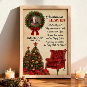 Honor the memory of a loved one and keep their spirit close during the holidays with this Personalized “Christmas in Heaven” Memorial Poster. Beautifully designed with a festive wreath, Christmas tree, and an empty red chair, this heartfelt artwork serves as a touching reminder that those we’ve lost are still with us in spirit. Add your loved one’s photo, name, and years to create a deeply personal keepsake that brings warmth, comfort, and reflection to your home each Christmas season.