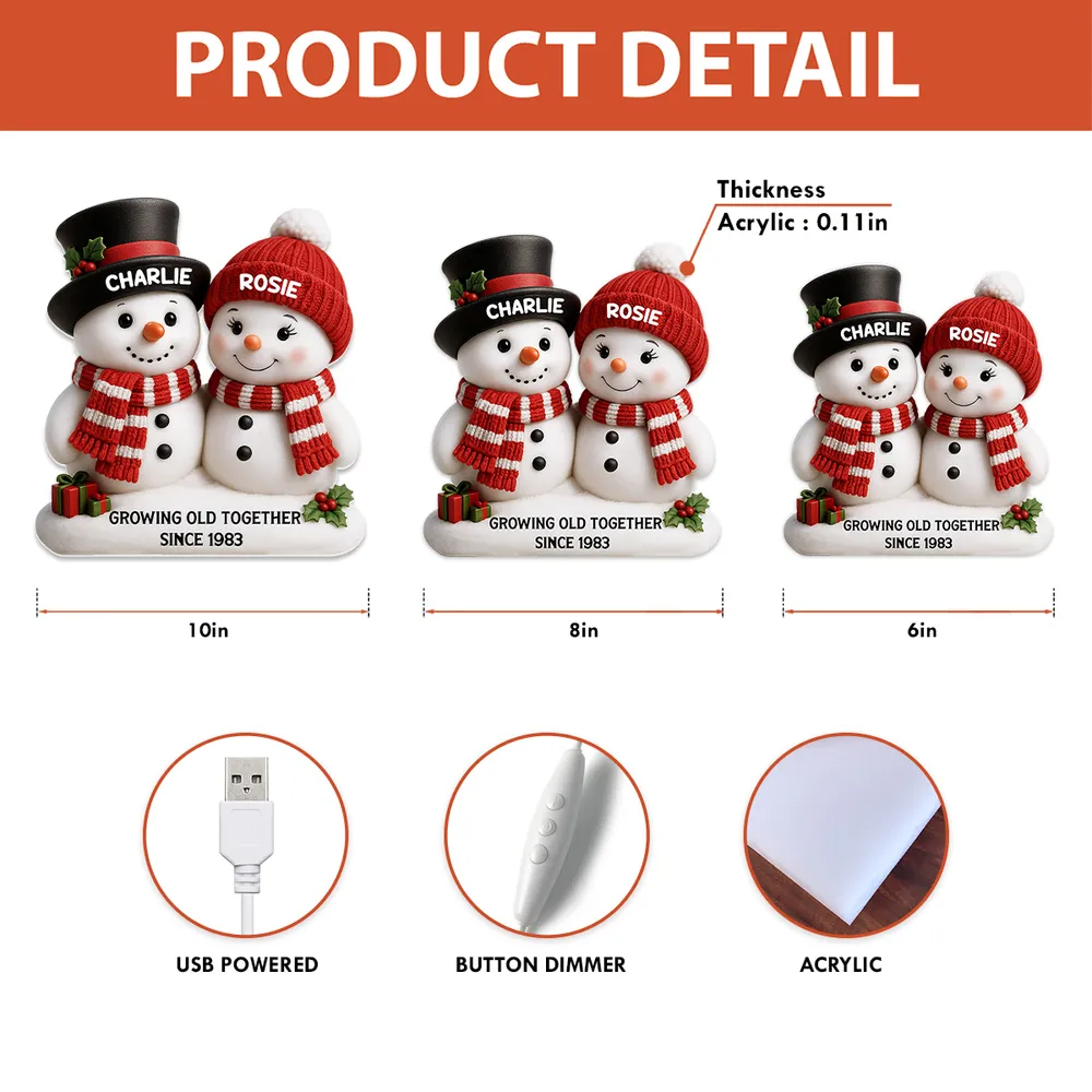 Celebrate a lifetime of love with this Christmas Snowman Couple Growing Old Together Personalized Light Box! This adorable light-up keepsake features a snowman couple in festive winter scarves, with personalized names and a special year. The soft, warm glow makes it a perfect addition to your holiday décor, creating a cozy and romantic atmosphere. This charming light box is the ideal Christmas gift for couples, capturing the warmth of love that grows stronger with time.