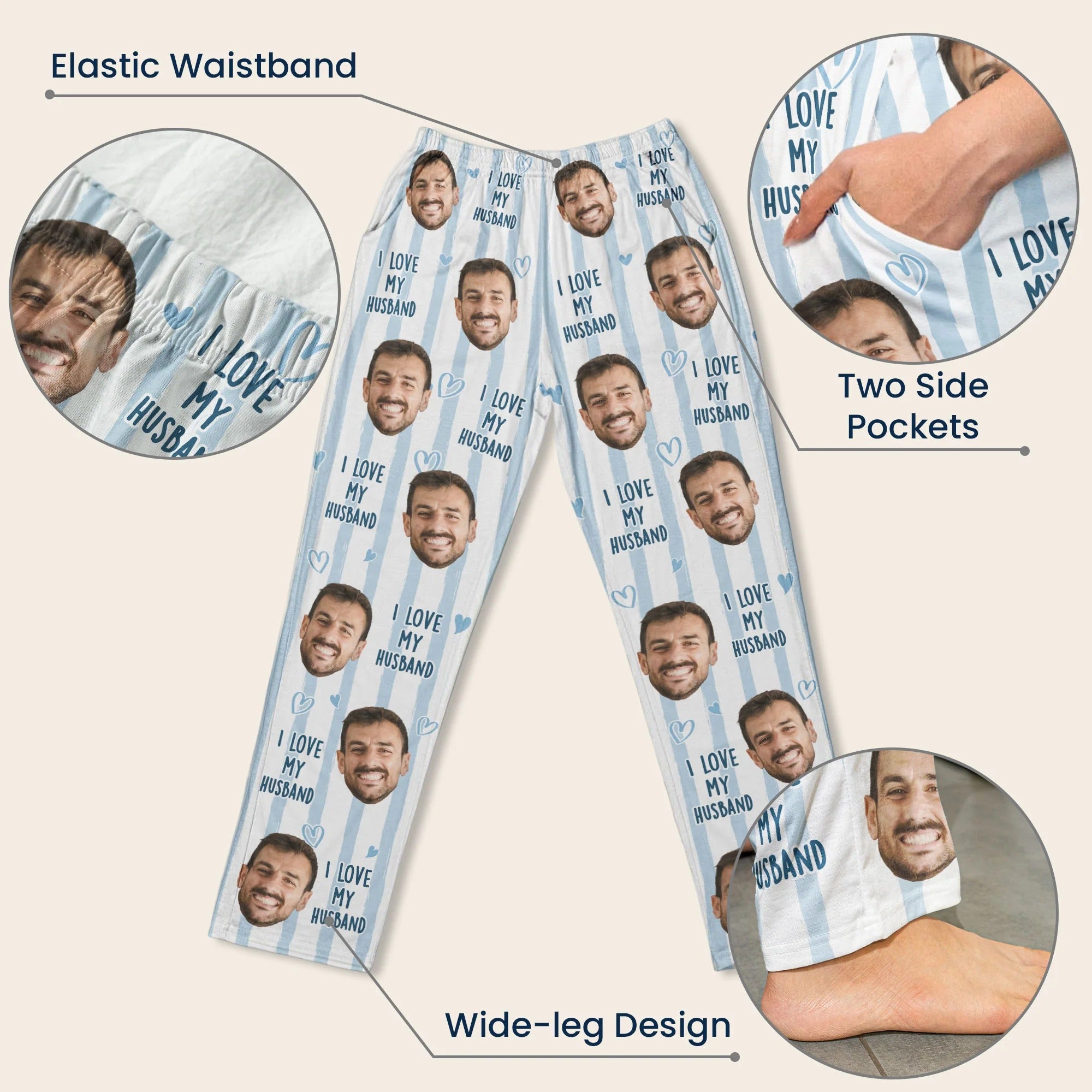 Looking for a thoughtful and fun gift for your loved one? Our Personalized Sweatpants, Lounge Pants With Pockets are sure to bring a smile to any recipient's face. As the name suggests, these fun, cozy sweatpants can be customized with your favorite photos, creating a memorable gift like no other. Perfect for your wife, husband, girlfriend, boyfriend, or couple friends, these pants are a splendid memento of shared memories, capturing your favorite moments on a funny stripe background.