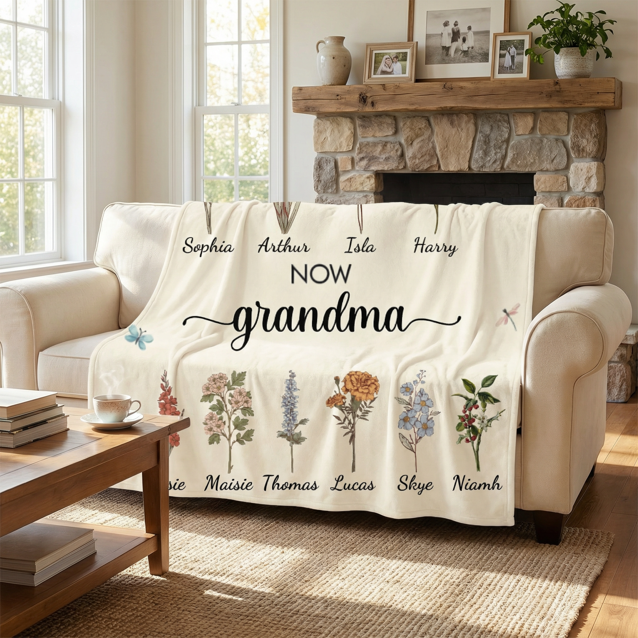 Celebrate the beautiful journey from motherhood to grandmotherhood with this thoughtfully personalized blanket. Each design features delicate birth flowers paired with meaningful names, creating a timeless keepsake that honors both generations. Crafted with premium materials for lasting comfort and durability, this blanket serves as a touching Mother's Day or Grandma gift that captures cherished milestones. Perfect for displaying, gifting, or wrapping up in warmth, it's a heartfelt tribute to the women who shape our lives. A truly memorable present that blends sentimentality with everyday elegance.