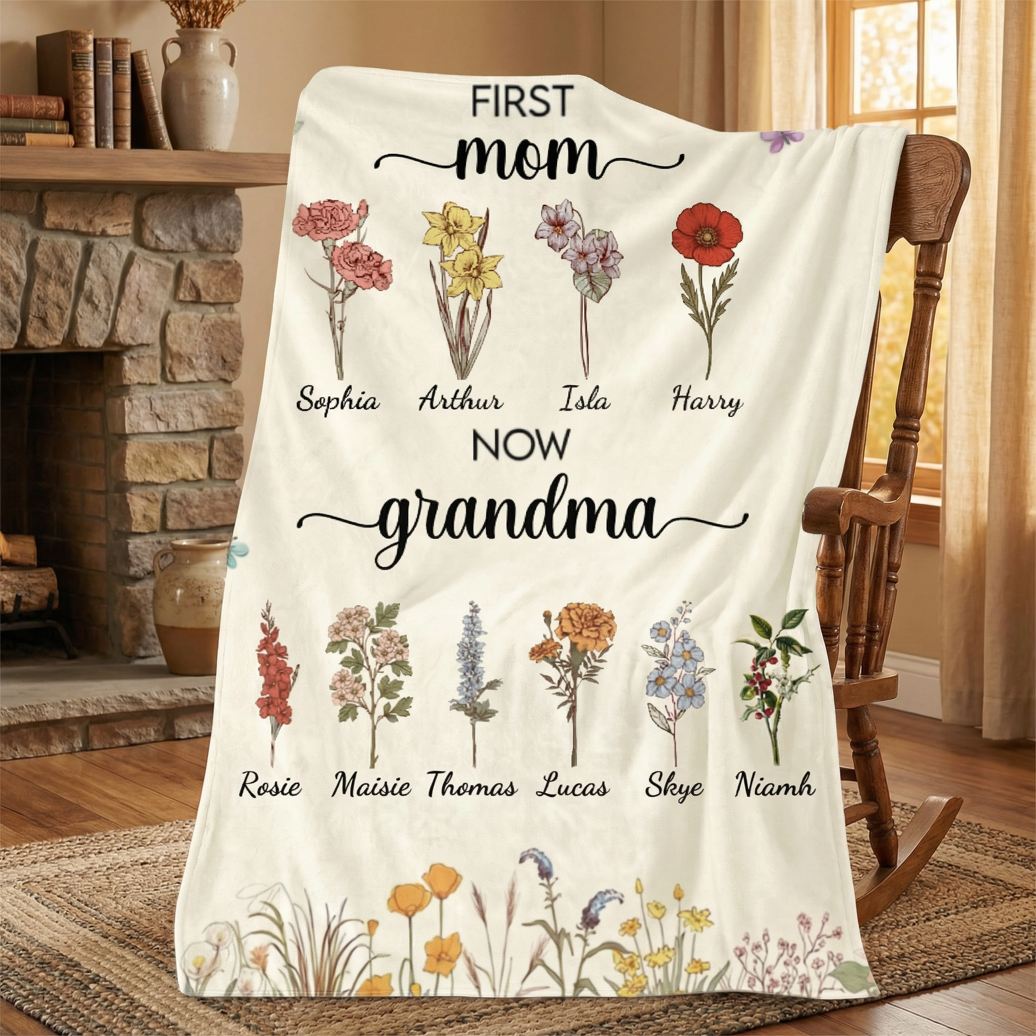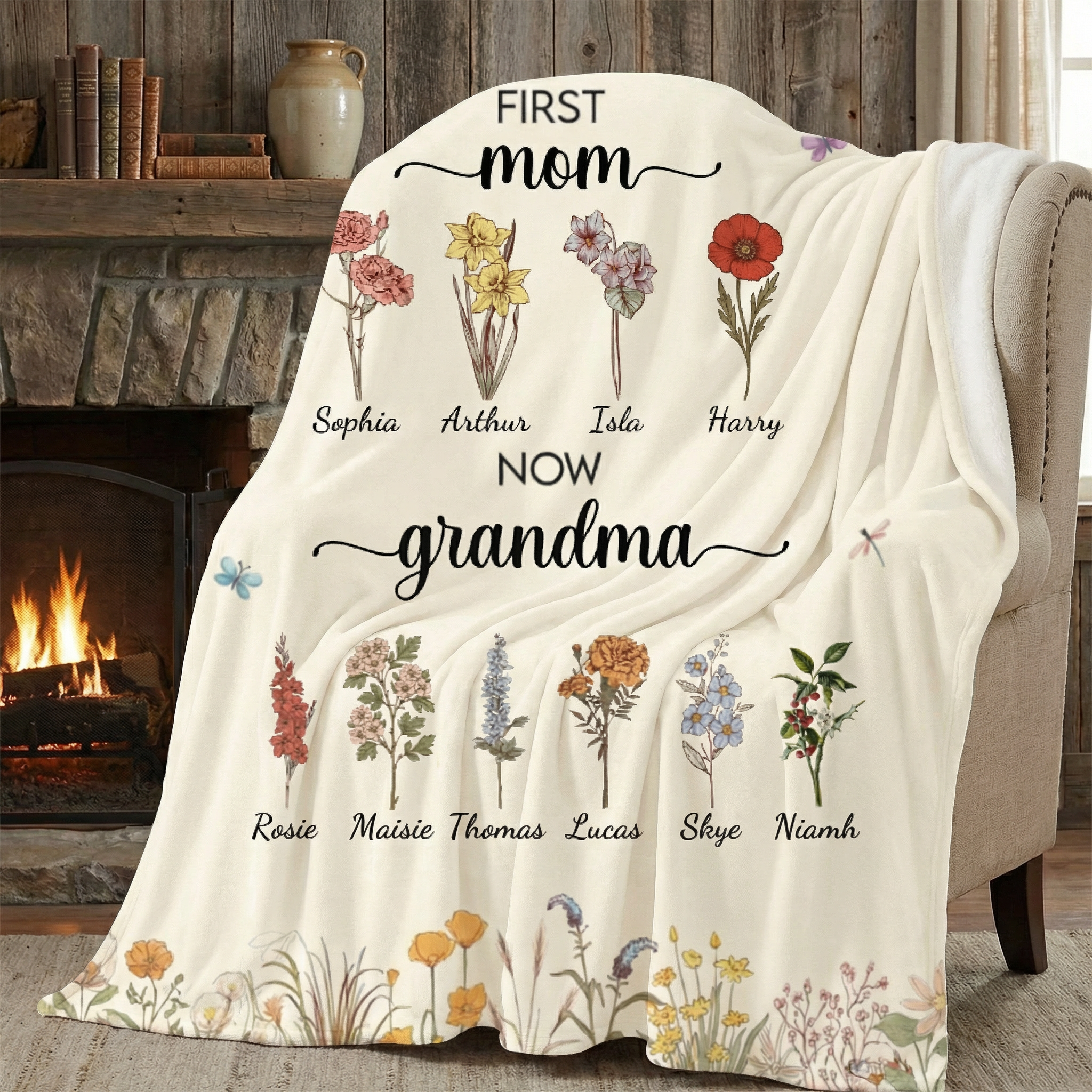 First Mom Now Grandma Gift | Personalized Birth Flower Blanket with Names | Mother's Day & Grandma Keepsake
