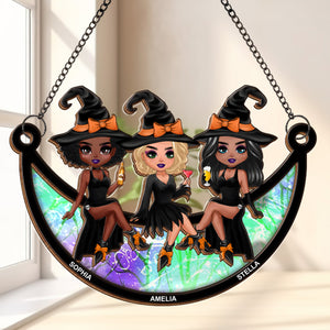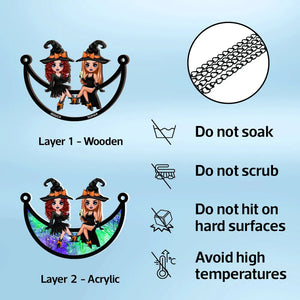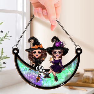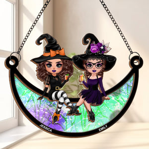 Halloween Witch Besties Sitting On Moon Personalized Window Hanging Suncatcher Ornament, Halloween Decor