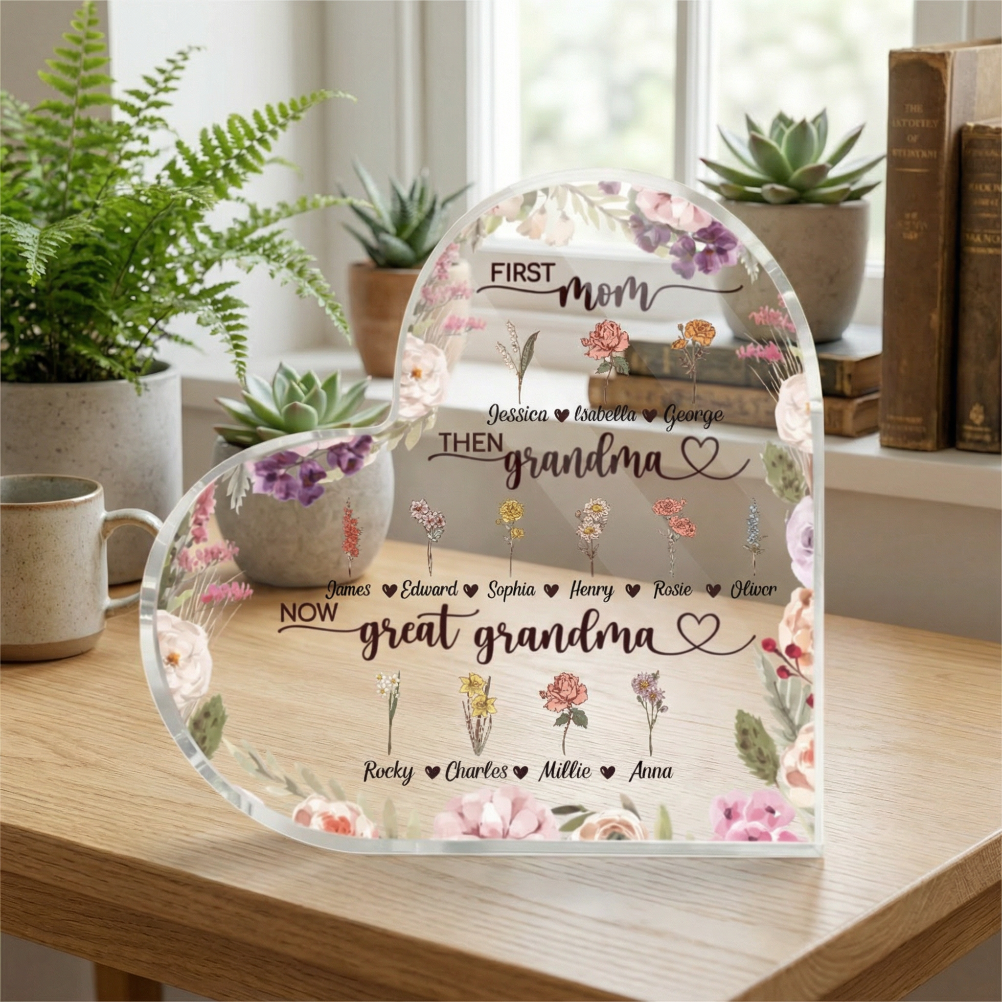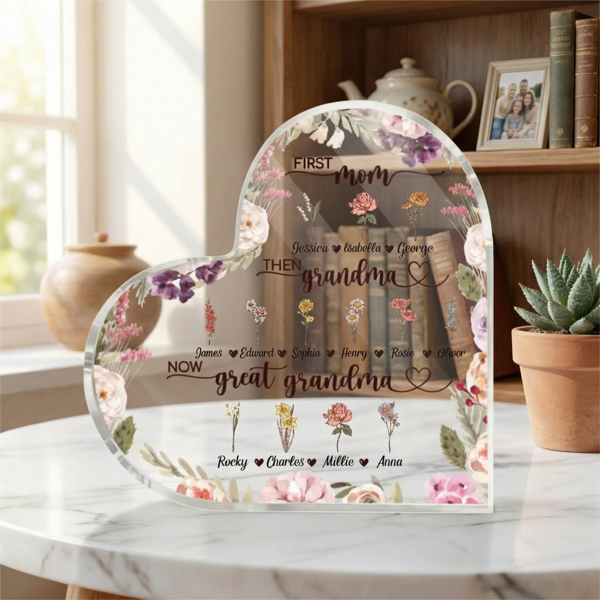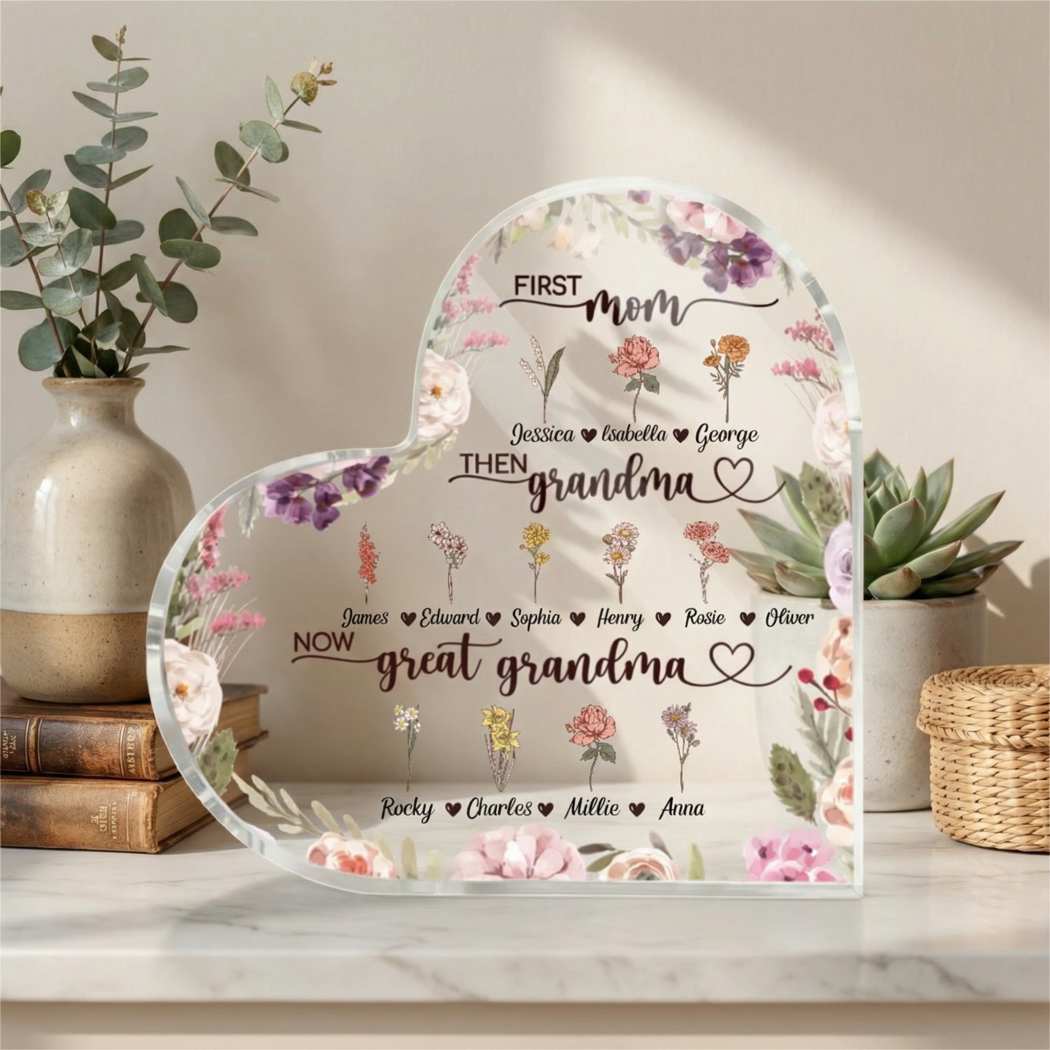Her Blossoming Legacy: A Custom Acrylic Heart Plaque Celebrating Generations of Mothers in Your Family