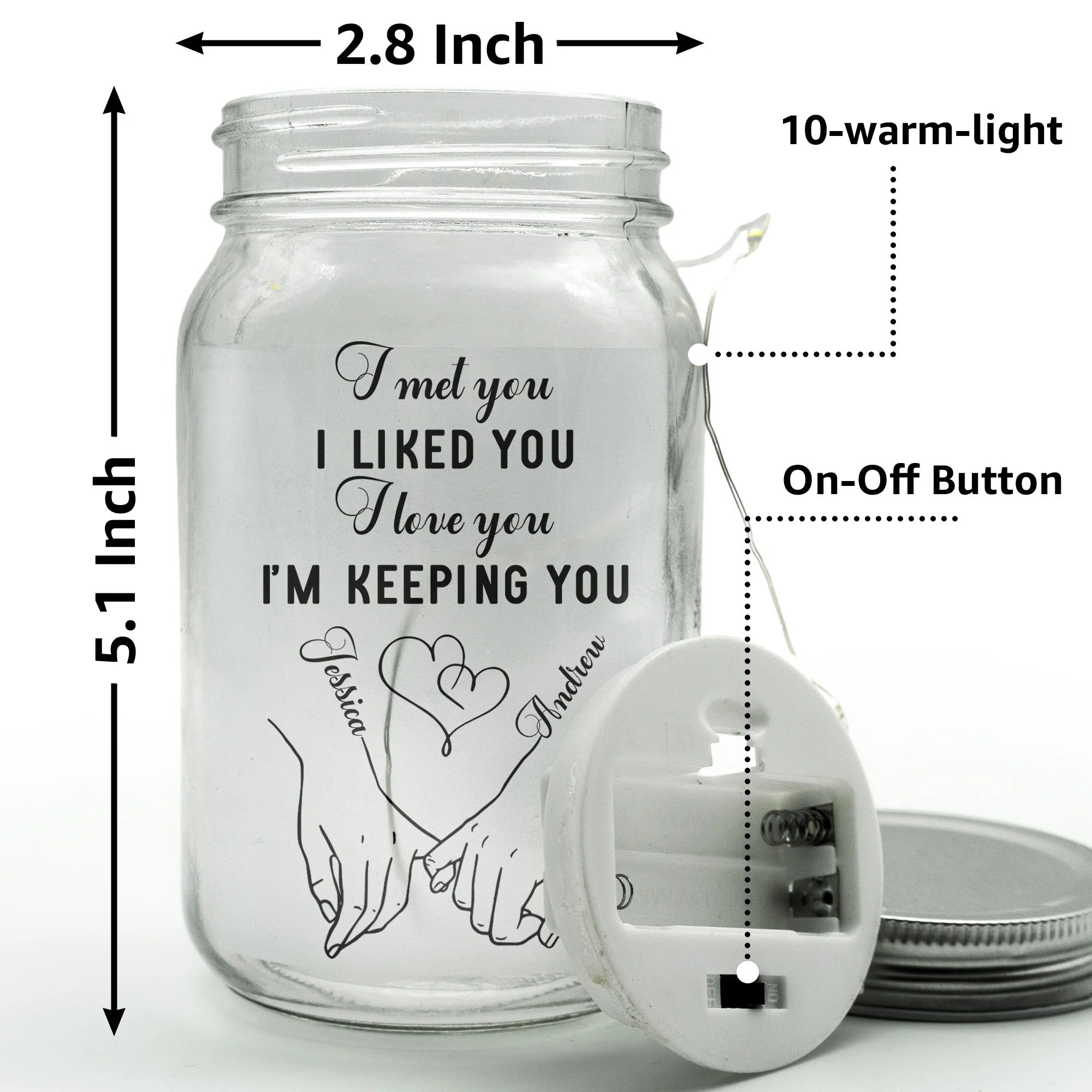 Introducing our I Met You Liked You Love You Custom Name & Calendar Mason Jar Light, designed to encapsulate a love story in the lustrous glow of romantic ambiance. A visual representation of your journey that shines, it brings to life the significant days when you met, connected and committed to your partner. It's a heartwarming symbol that underlines the special bond you share, illuminating all the points where your paths converged, creating the perfect union you celebrate today. It's a remarkable gift item that speaks of bonded love and shared history, making it an exceptional choice for any couple.