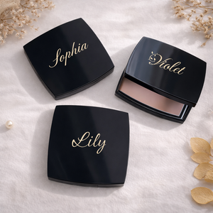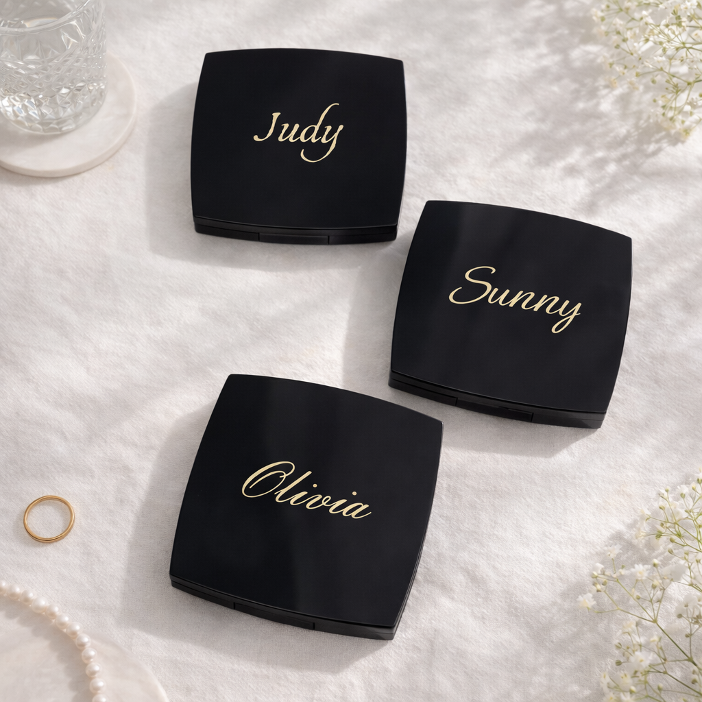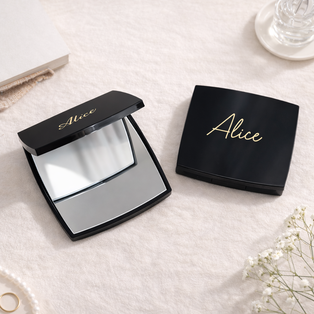 Elevate your beauty routine with this sophisticated monogrammed makeup mirror. Featuring a sleek black square compact design, this personalized piece combines functionality with timeless elegance. The engraved name adds a distinctive touch, making it an ideal gift for yourself or someone special. The compact size fits seamlessly into any bag or vanity, while the quality mirror ensures clear, reliable reflection for flawless makeup application. A practical accessory that celebrates individuality and style.