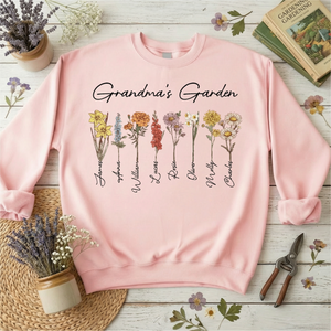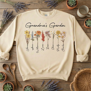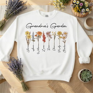 Celebrate the special women in your life with this heartfelt personalized sweatshirt. Featuring custom birth flowers representing each family member, "Grandma's Garden" creates a meaningful keepsake that honors motherhood and grandmotherhood. Soft, comfortable fabric makes it perfect for everyday wear or gifting on Mother's Day. Each design is uniquely customized to showcase the birth flowers of your loved ones, making it a truly one-of-a-kind present that she'll treasure for years to come.