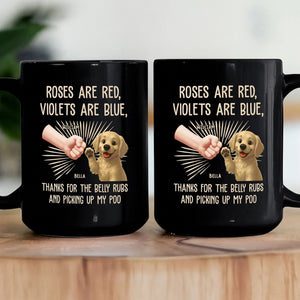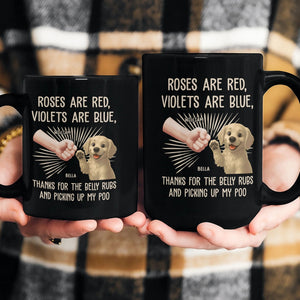 Introducing our delightful "Thanks For Belly Rubs" personalized mug. This charming product is more than just a mug, it's a token of affection between any pet lover and their precious pupper! The humorous underlining sentiment is sure to bring a smile on your morning coffee routine, as it gracefully speaks of gratitude for belly rubs and even for dealing with the less glamorous aspects of pet care. This unique item subtly emphasizes bonding and resemblance with your canine companion.