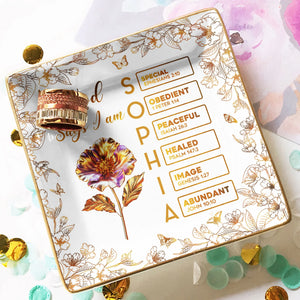 Introducing our Personalized Square Jewelry Dish, a unique blend of meaningful symbolism, personalization, and practical use. This exquisite piece, titled "You Are Custom Name Letter In Bible Gold Birth Flower Style," underscores love, bonding, and faith, making it a treasured keepsake.