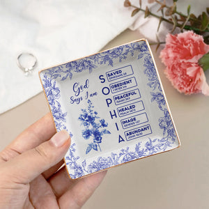 This Personalized Jewelry Dish, entitled "God Says I Am Name Letter In Bible Toile De Jouy Style," is a heartfelt keepsake for those rooted in Christian faith and the power of affirmation. Designed to remind us how God views us and our loved ones, this jewelry dish is more than storage—it’s a reflection of divine likeness and an emblem of spiritual encouragement.